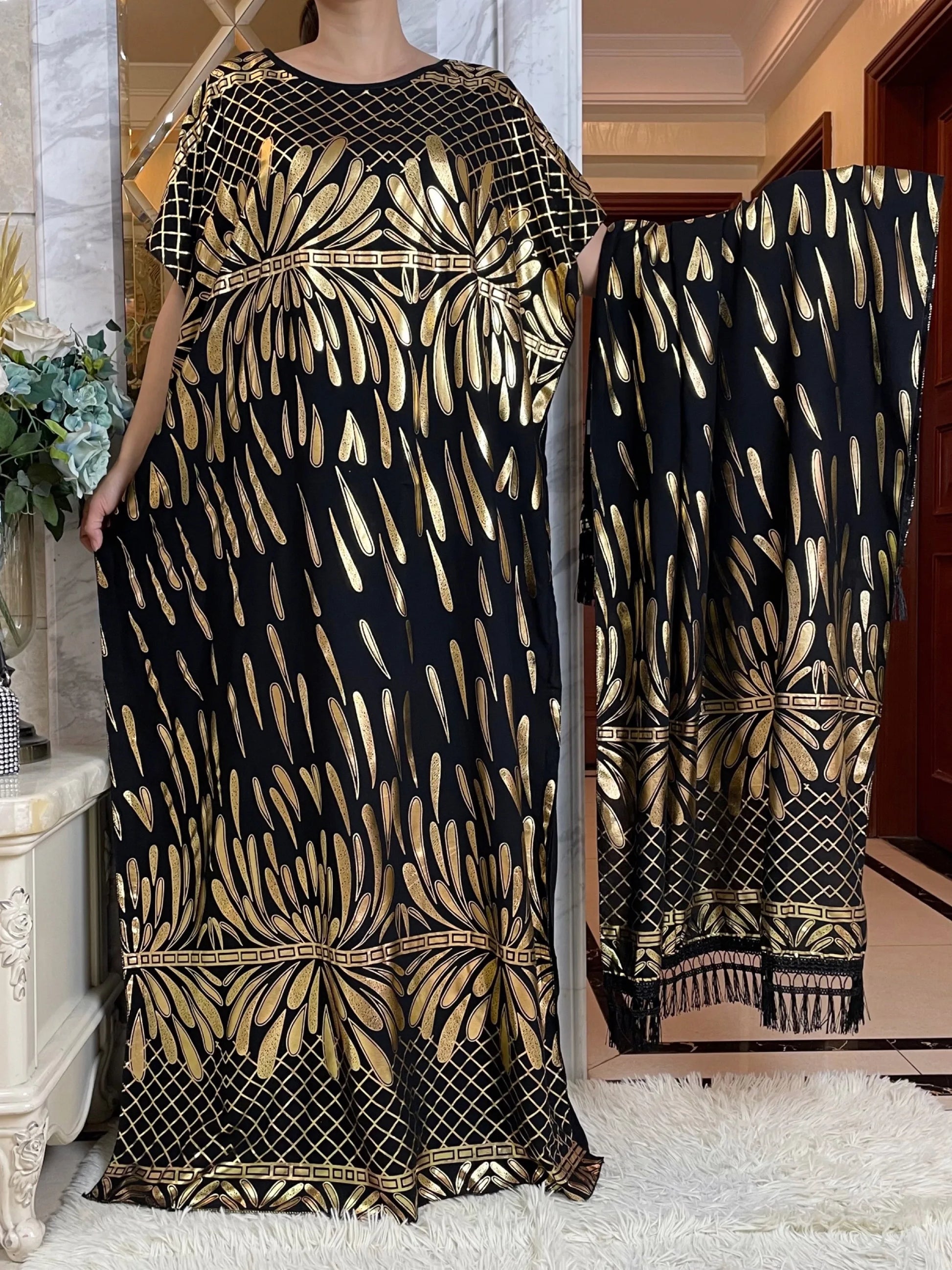 2024 Summer Short sleeve Dress Pure Cotton Gold Stamping Loose Abaya Maxi Islam Dress With Tassels Big Scarf African Long Dress
