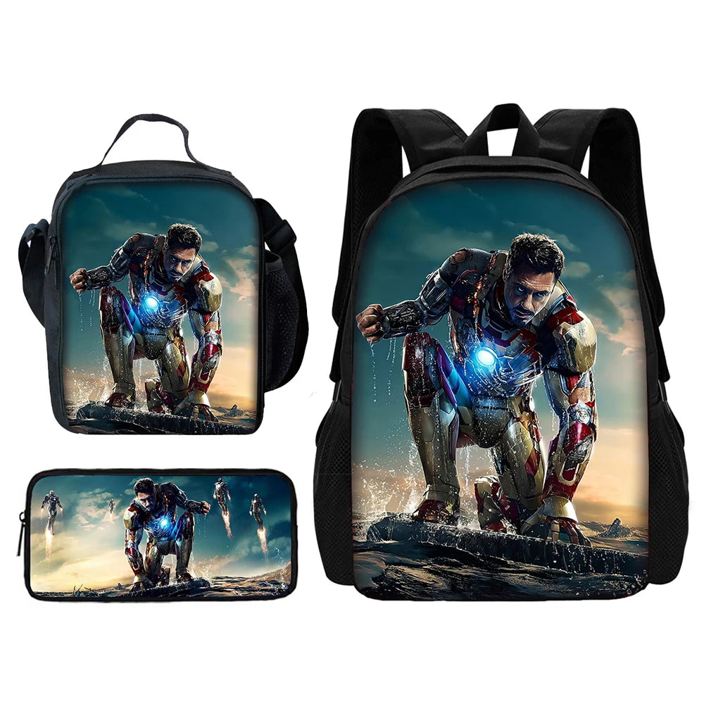 Cartoon Man M-Marvels Iron 3 pcs set Child School Backpack with Lunch Bags ,Pencil Bags School Bags for Boys Girls Best Gift