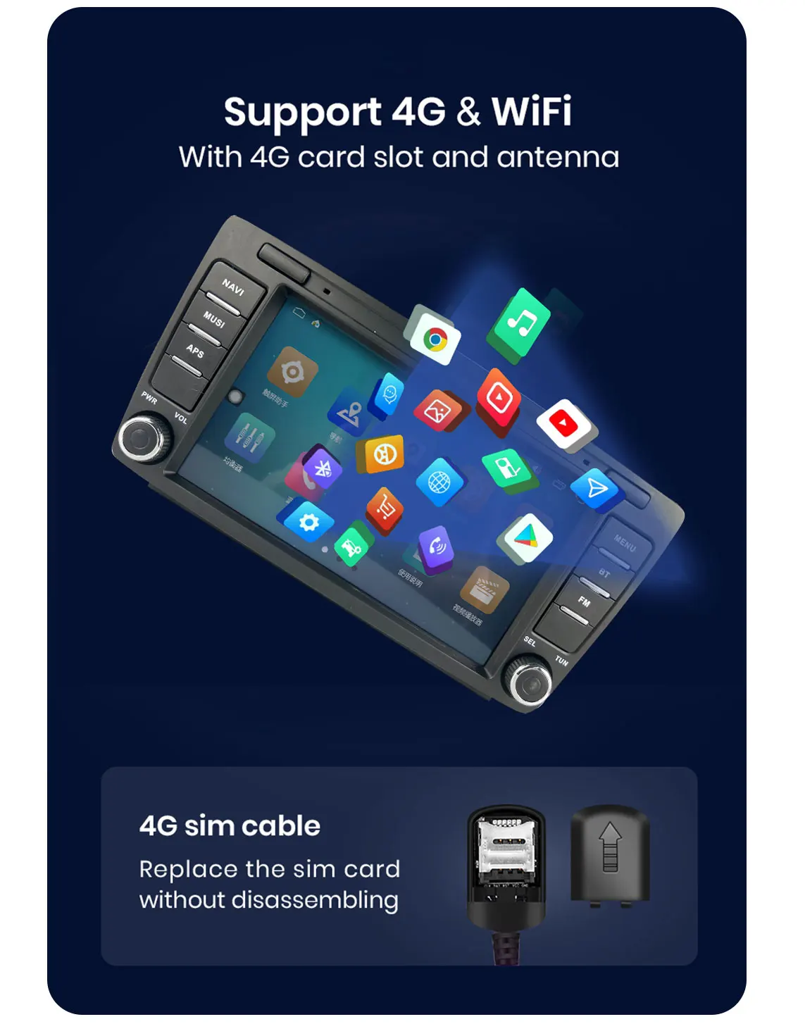 Built-in WiFi,Support 4G SIM Card Read,Support to connect to any network hotspot via WiFi or 4G, you can use the online navigation, online video online music, you can use google play store to download any APP you need.