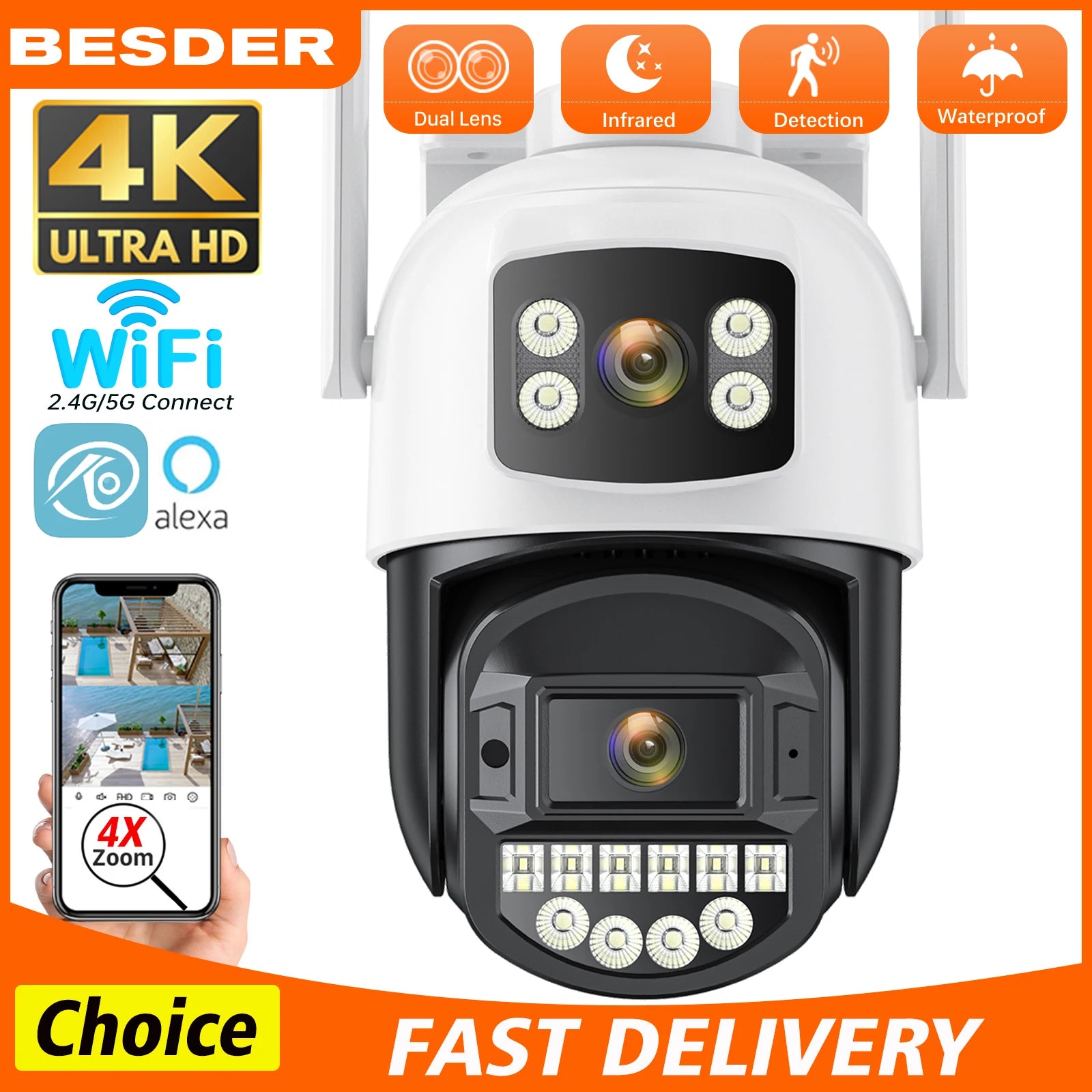 10MP IP Camera Outdoor 5G WiFi Camera 4X Zoom 4K 8MP HD Dual Lens Two Way Audio AI Auto Tracking CCTV Video Surveillance Camera