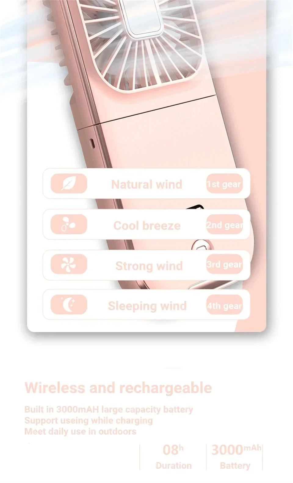 3000mAh Battery Powered Mini Portable Outdoor Handheld Fan Neck Fan USB Rechargeable 180° Folding Wireless Desktop Air Cooling