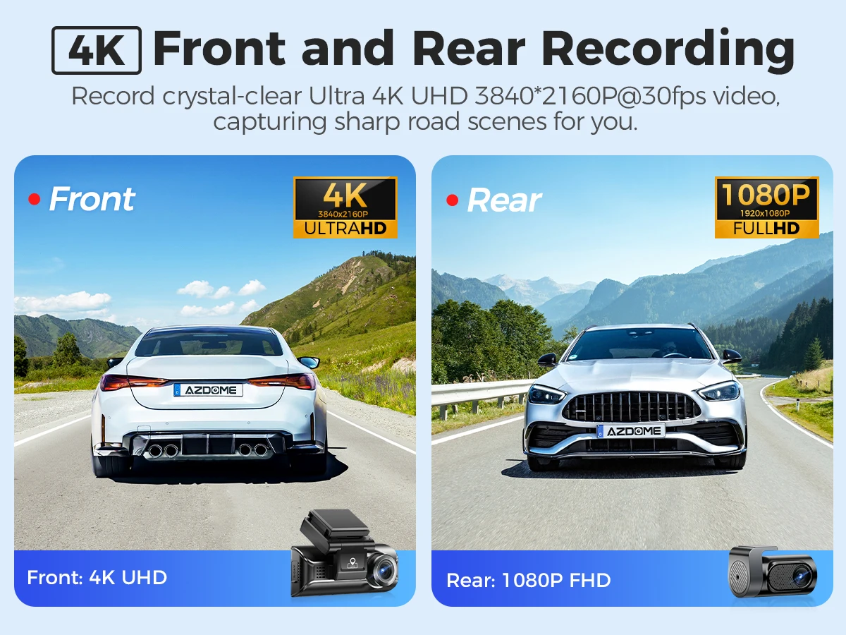 Front Camera: 4K Ultra HD (3840x2160) resolution for crystal-clear footage of the road ahead.