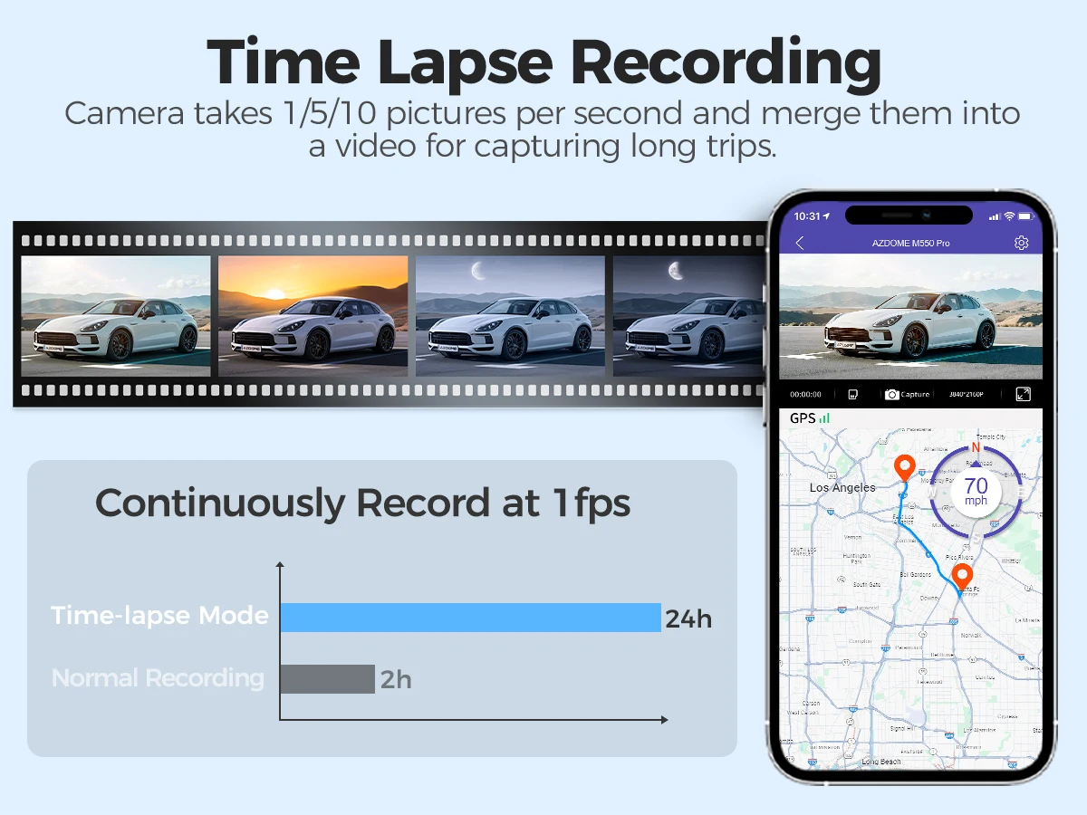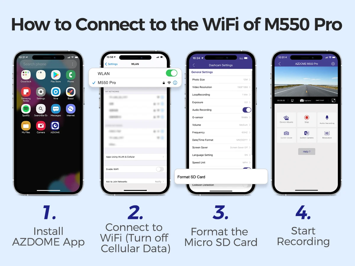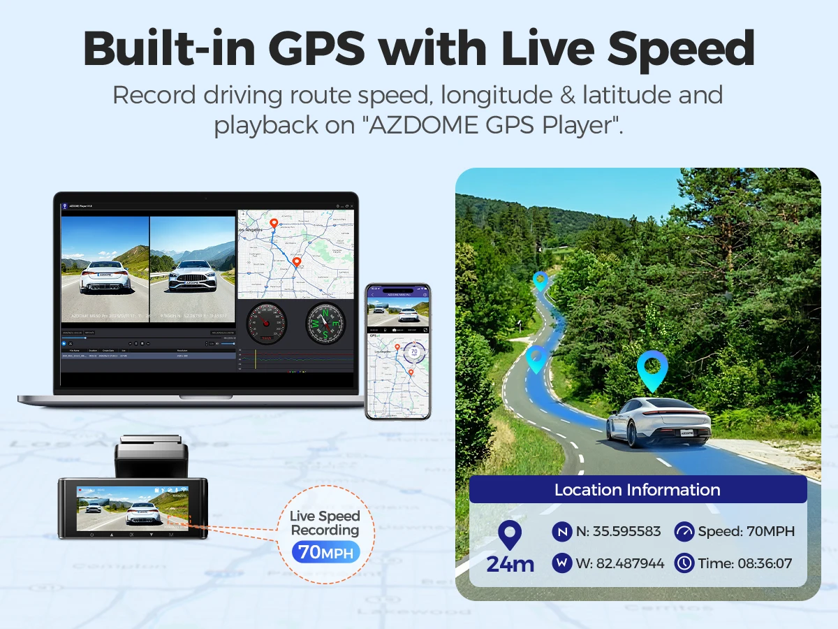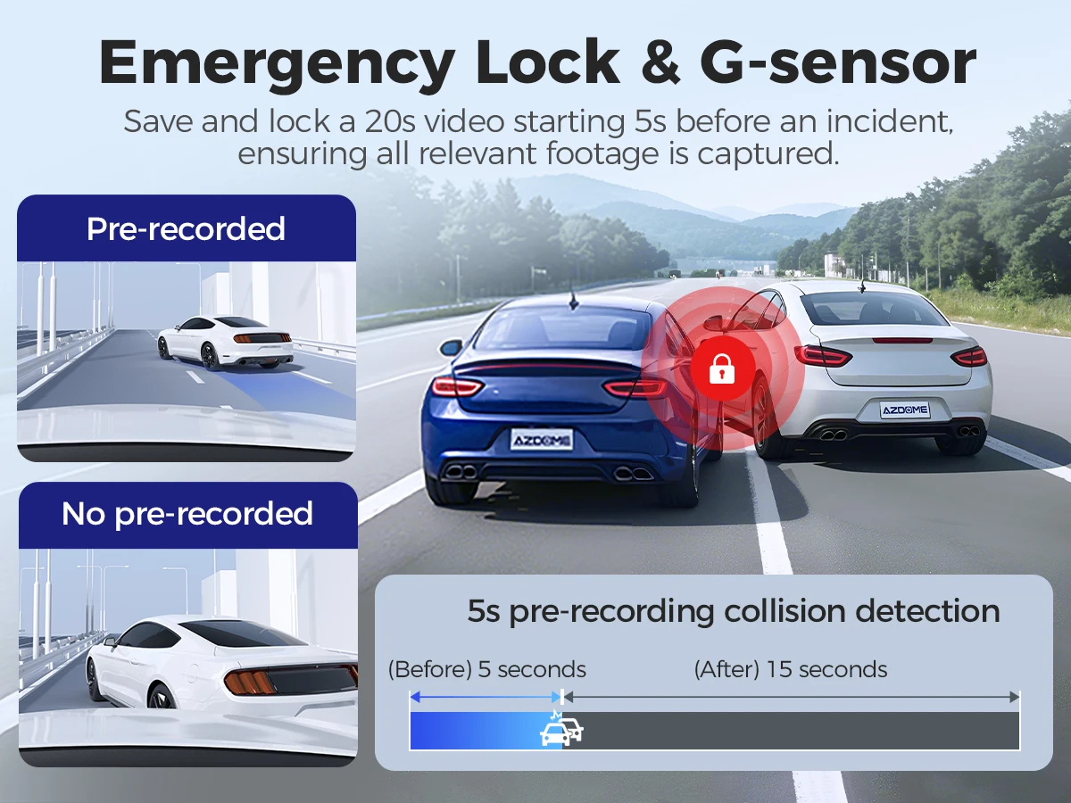 Connect the dash cam to your smartphone via the AZDOME app (available for iOS and Android) using 5GHz Wi-Fi for faster and more stable data transfer. Easily view, download, and share footage.