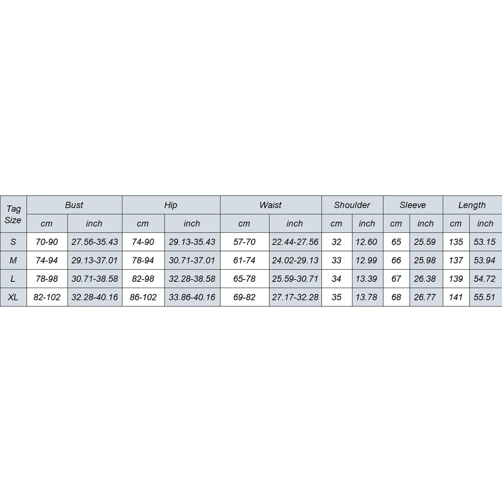 Size:M | bust:74-94cm/29.13-37.01'' | Waist:61-74cm/24.02-29.13'' | Hip:78-94cm/30.71-37.01'' | Shoulder:33cm/12.99'' | Sleeve:66cm/25.98'' | Length:137cm/53.94'' |