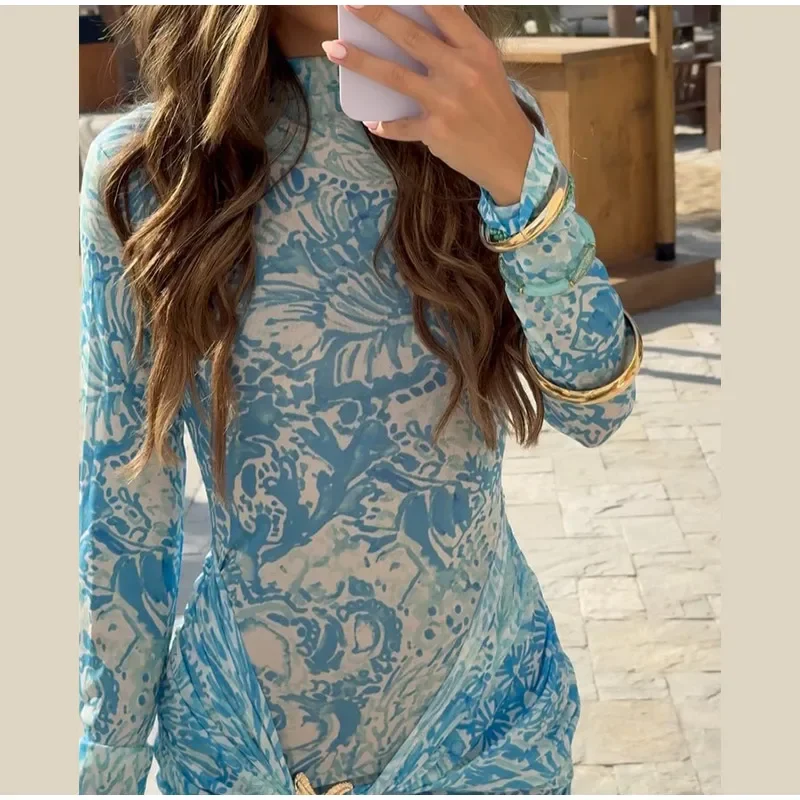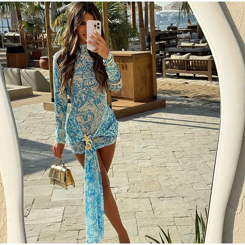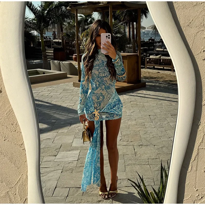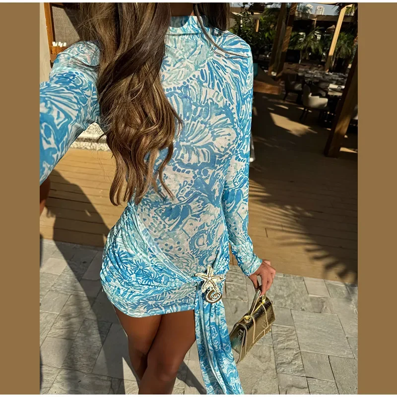 Elegant Blue Printed Mini Vestido Women Chic Long Sleeve High Round Neck Slim Pleated Dress 2025 Summer Female Party Dinner Wear