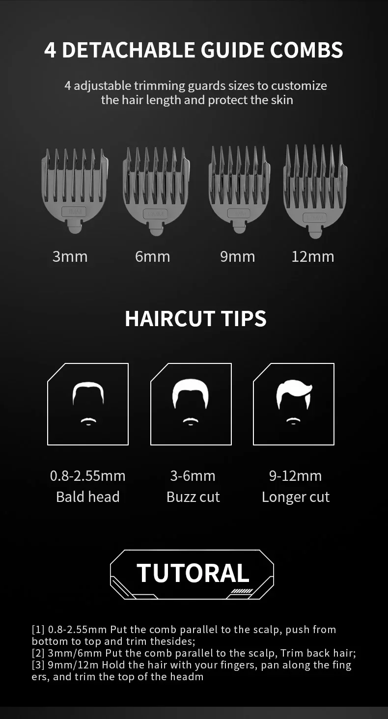 [1] 0.8-2.55 mm Put the comb parallel to the scalp, push from bottom to top and trim the sides;