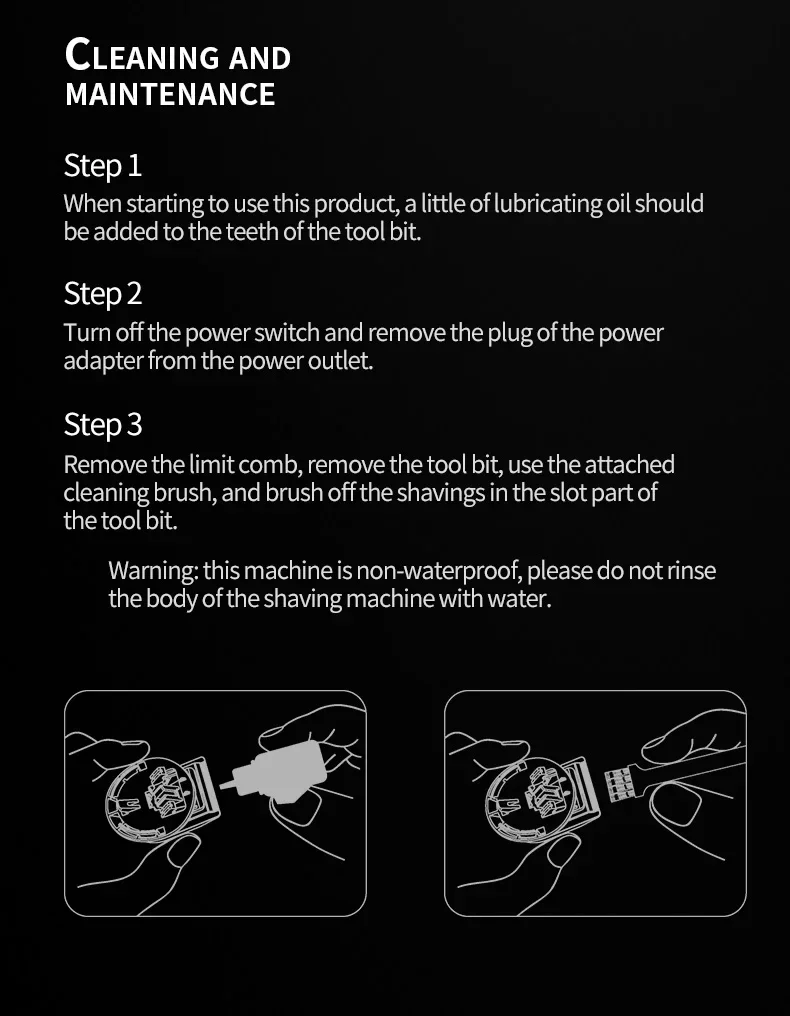 Warning: this machine is non-waterproof, please do not rinse the body of the shaving machine with water.