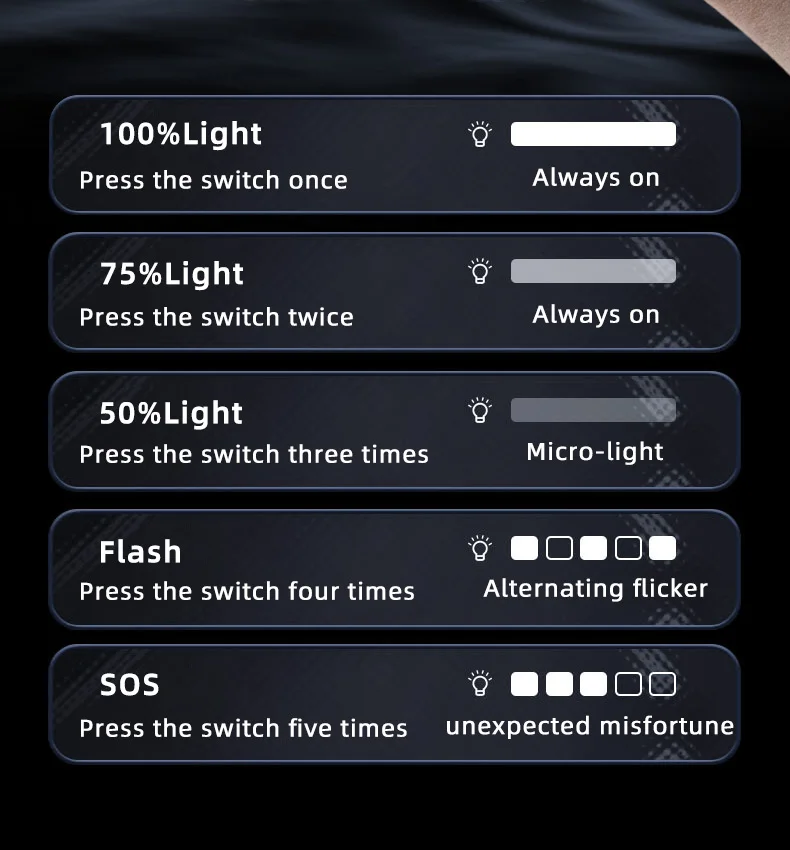 [Gear]: strong light - medium light - low light - burst flash - SOS (long press shutdown)