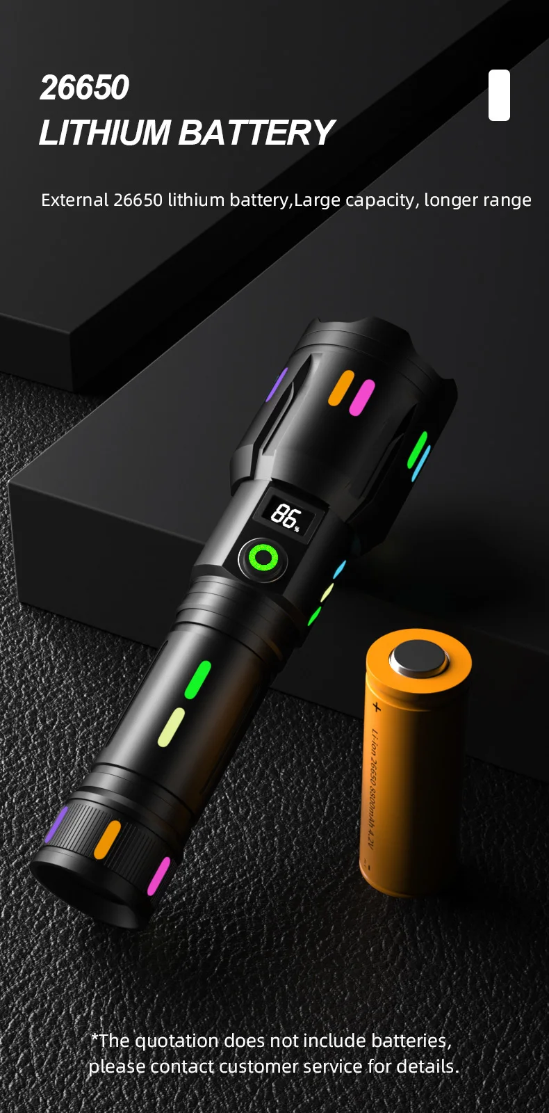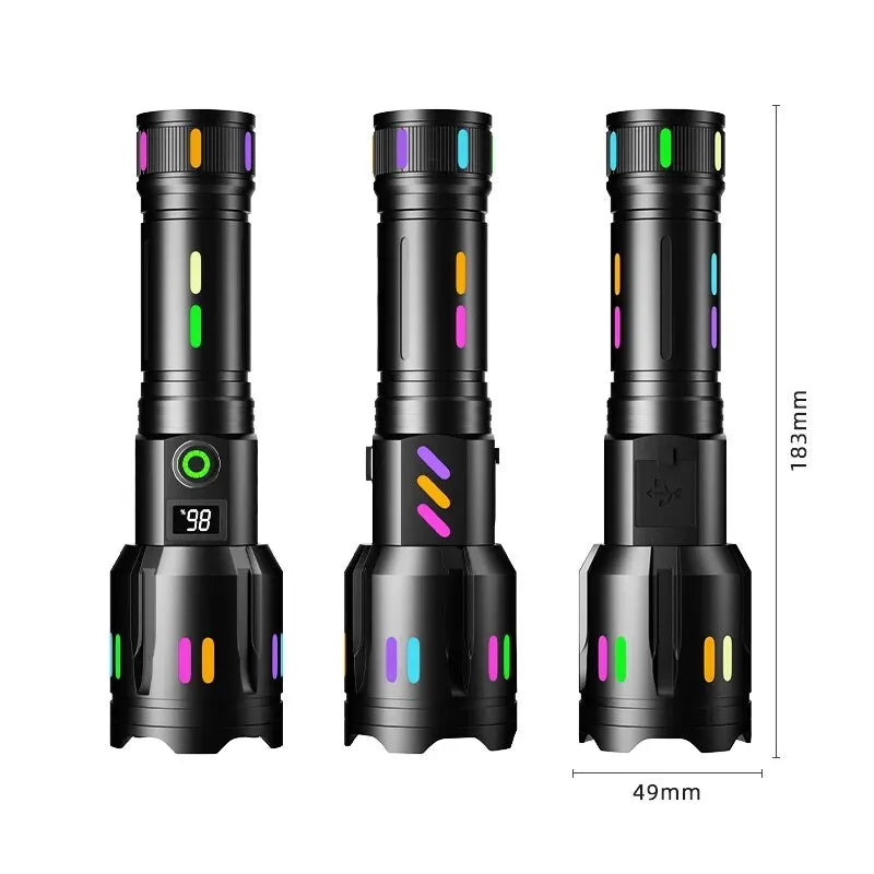 High Power Spotlight Long Range LED Flashlight Fluorescent Absorbing Film Luminous Colorful Zoom Flashlight Camping Emergency