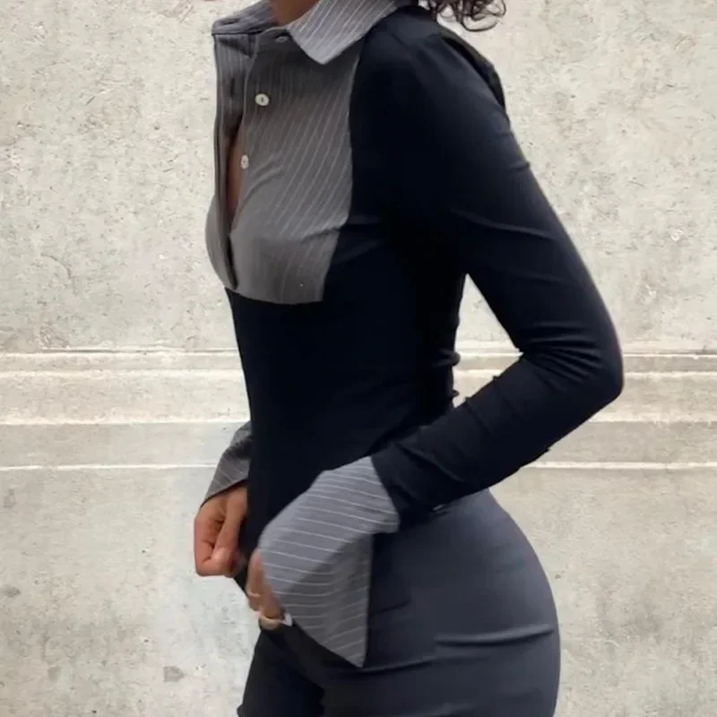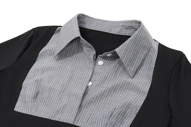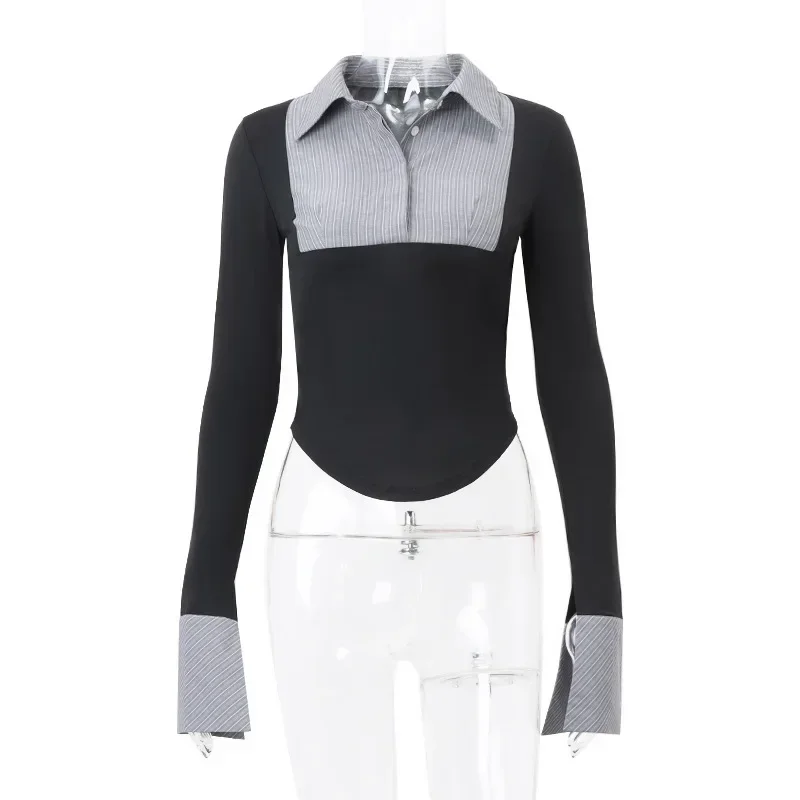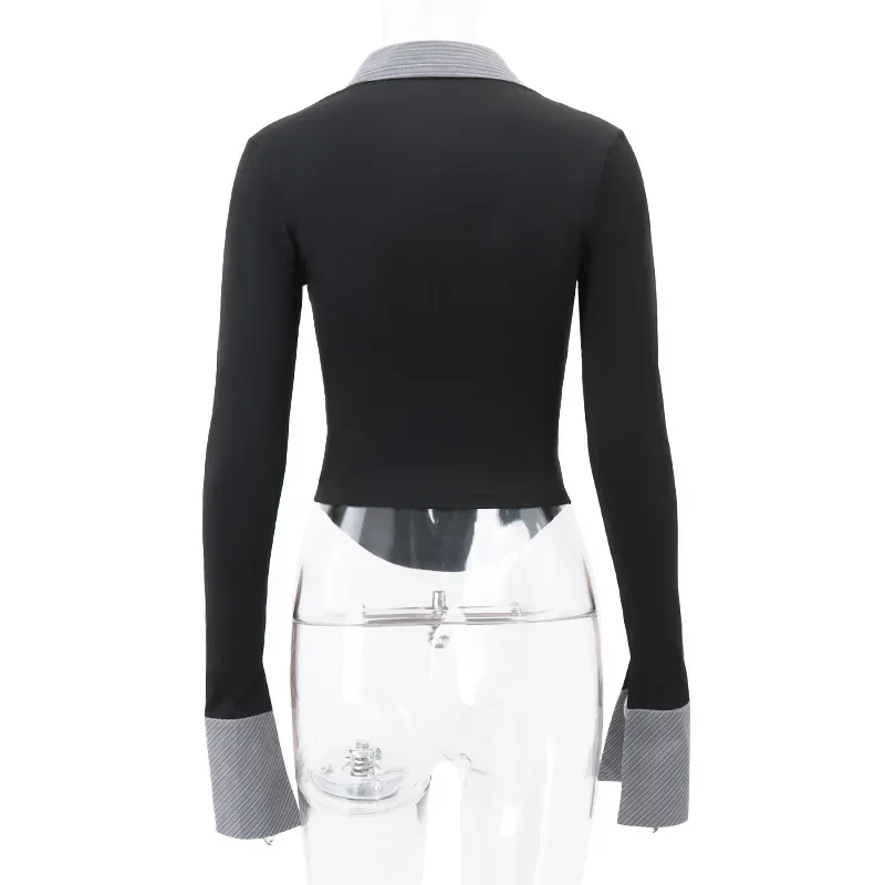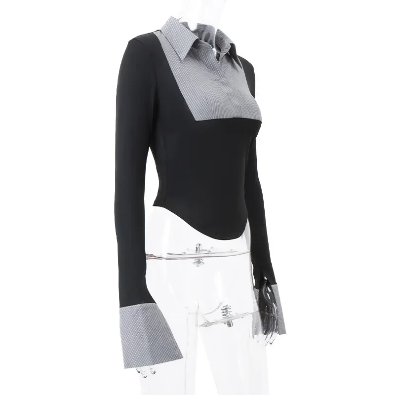 Official Ladies Stripe Print Patchwork Shirts Fashion Polo-neck Button Skinny Crop Tops Autumn New 2024 Elegant Shirts