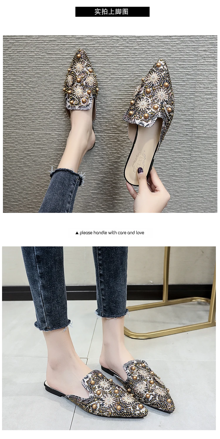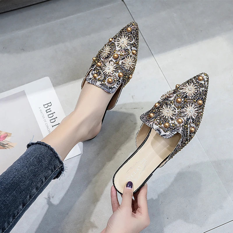 Summer 2023 New Elegant Women Rivets Slides Mules Breathable Flat Slippers Closed Toe Slides Party Shoes