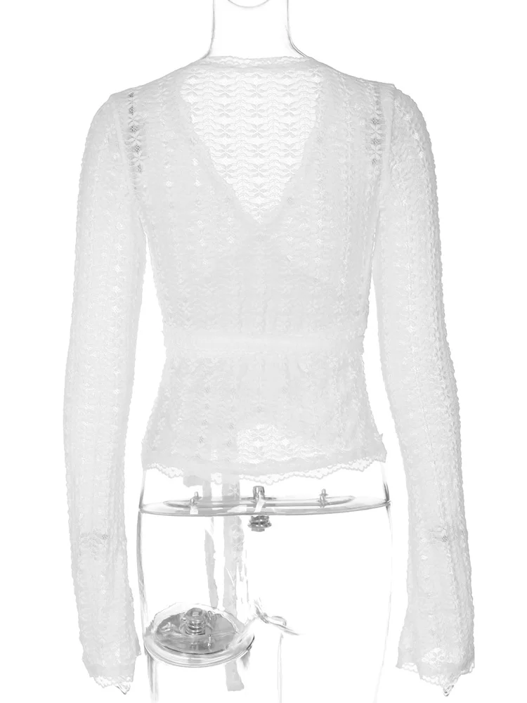 Tossy Bandage Hollow Out V-Neck T-shirt Top Women's Bandage Long Sleeve See-Through Sexy Casual Pullover Female Printed Tee Top