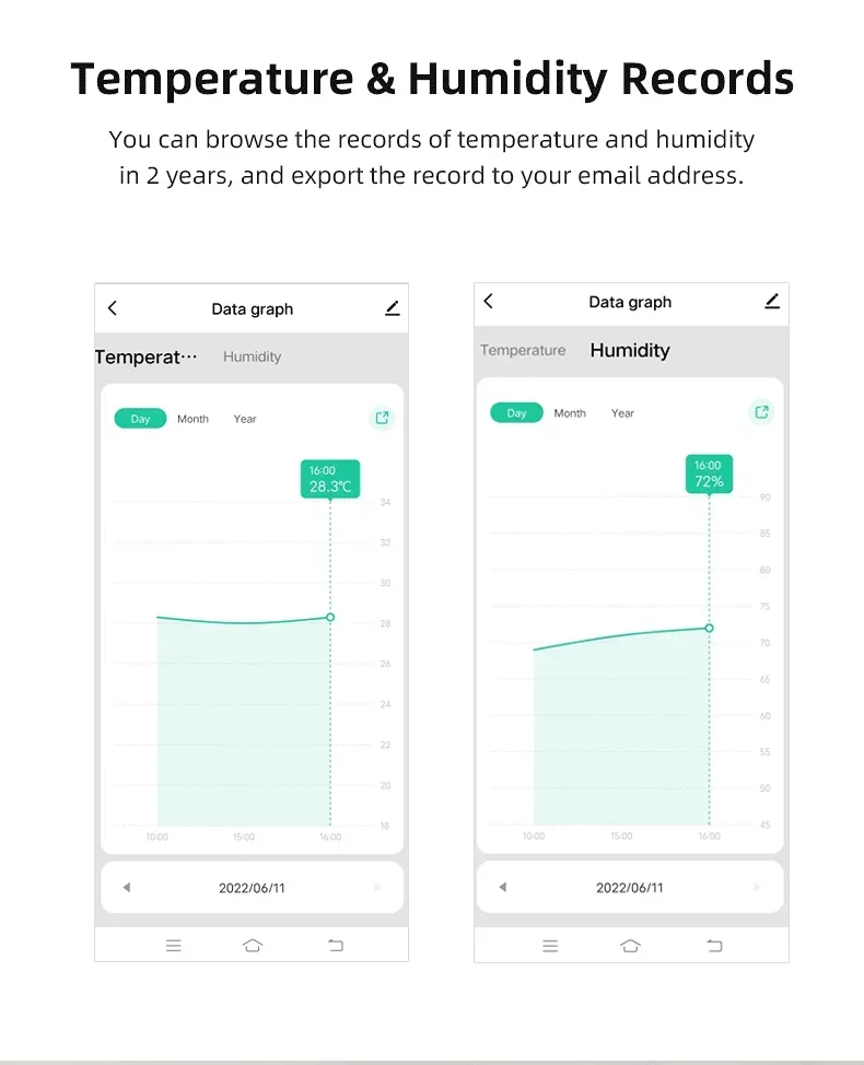You can view the historic curve of the temperature and humidity in the APP, and export to your email address.