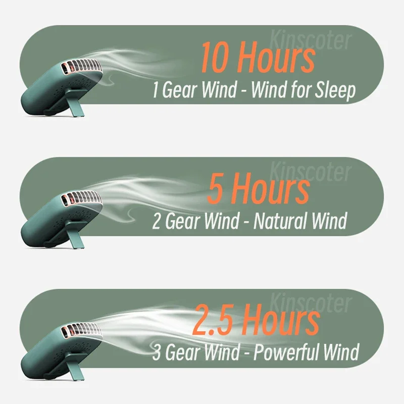 Battery life: about 10 hours for 1st gear, 4.5 hours for 2nd gear, 2.5 hours for 3rd fan