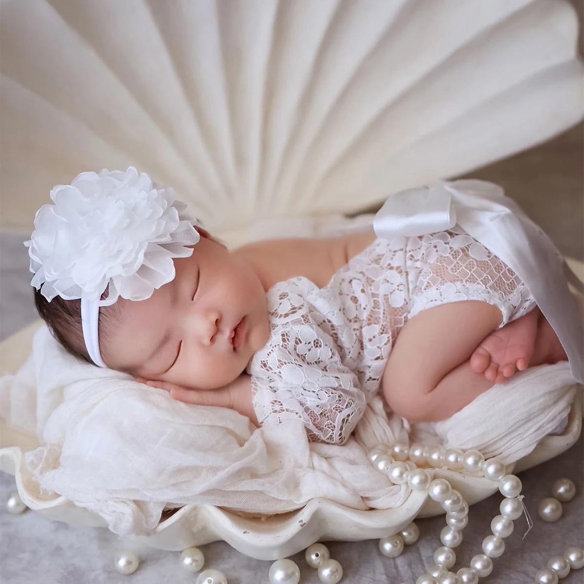 Ylsteed Newborn Photoshoot Outfit Big Bowknot White Long Sleeve Lace Romper with Headband Photo Props for Infants Portrait prop